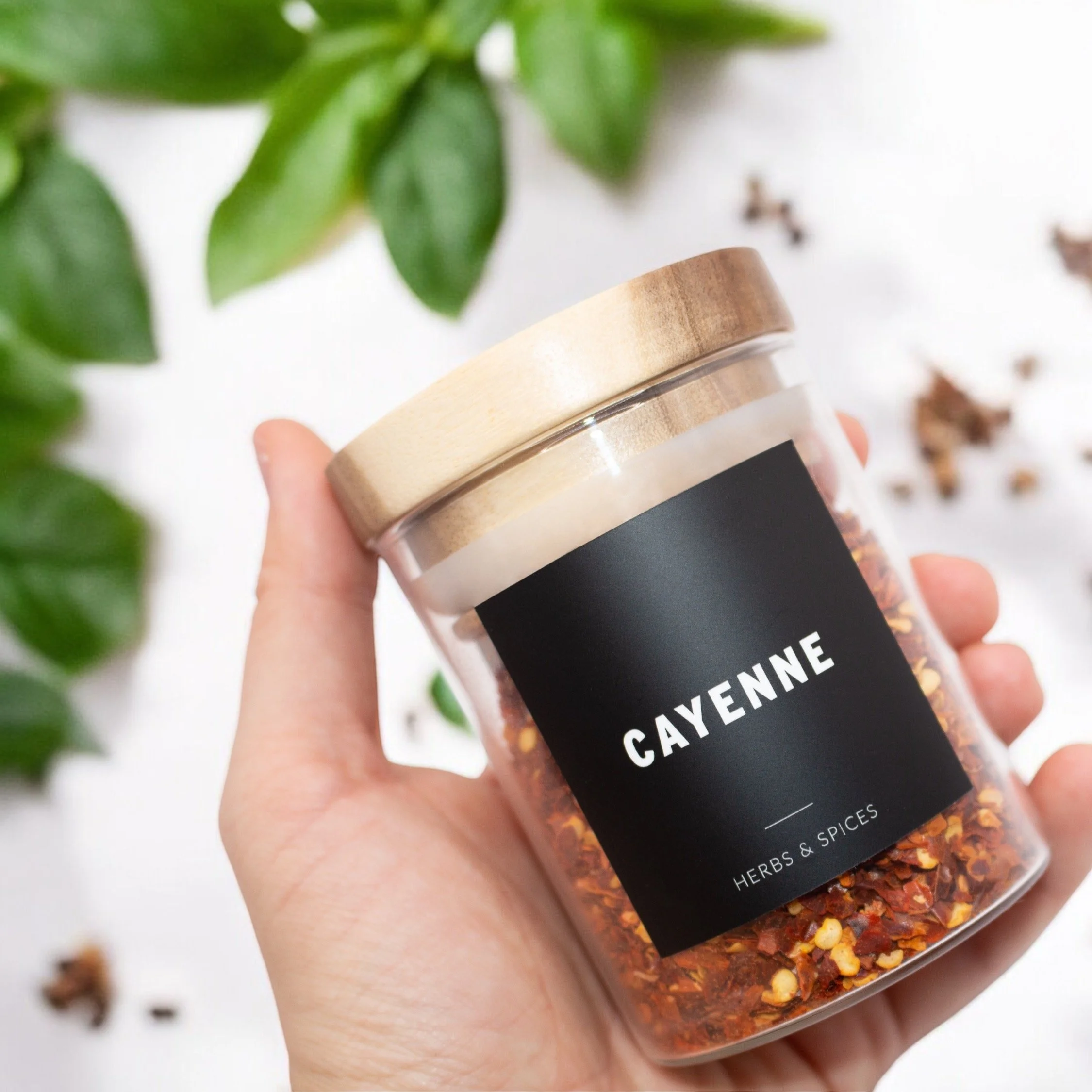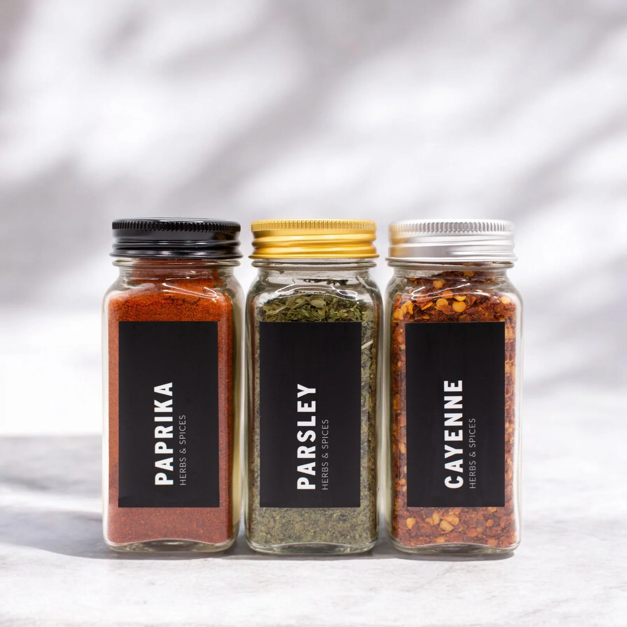 Disponibles avec ou sans étiquettes autocollantes en vinyle résistant à l'eau, nos étiquettes vous permettent d'identifier rapidement et facilement chaque épice.